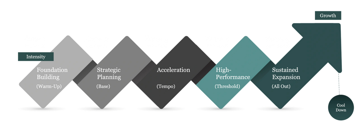 The Sprint Accelerator Model (SAM) leverages the concept of heart rate zone training used by elite athletes to guide businesses through a structured approach to achieving rapid, sustainable growth. Each zone represents a different intensity level, focusing on key aspects of business operations, ensuring that growth is not only rapid but also balanced and strategic.